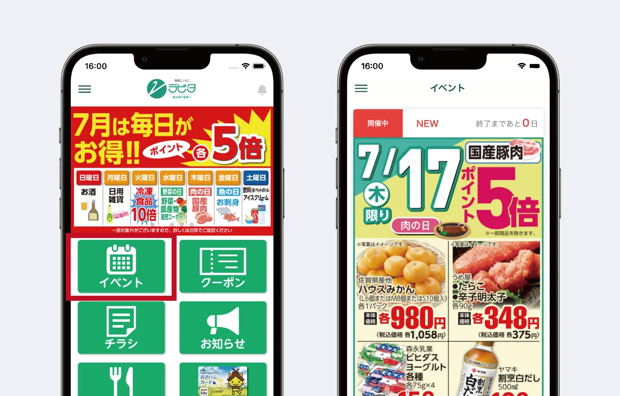 アプリホーム画面に配信中のイベント情報をスライド方式で表示することができます。配信中のイベントを分かりやすくユーザーに届けます。