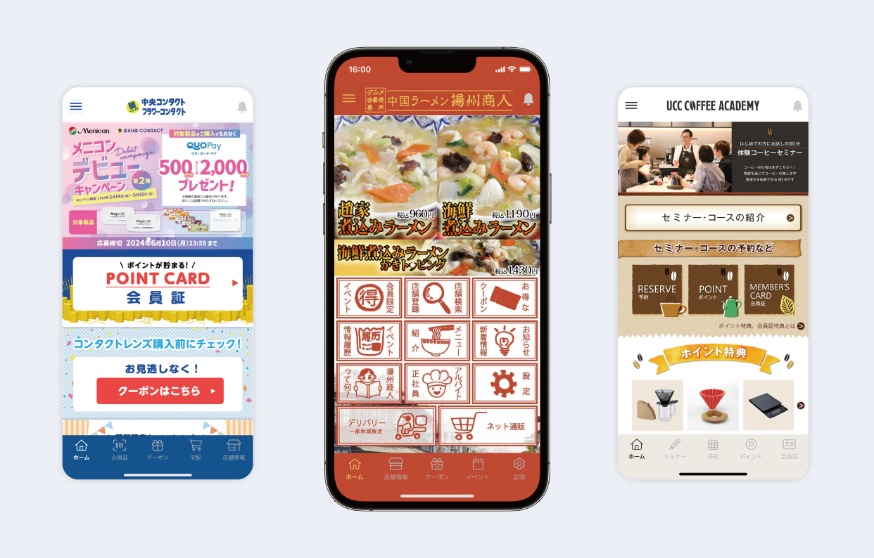ポイントシステムと連動可能。現在のポイント数やバーコード、会員番号などを表示することができ、アプリ提示でポイント付与などが可能に。