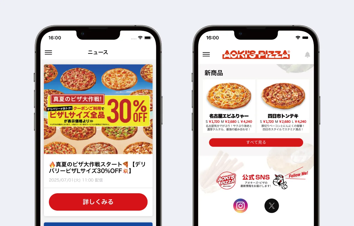 イベントや新商品の情報をプッシュ通知でリアルタイムに配信。通知とアプリのTOP画面に掲載し、情報発信力を強化。