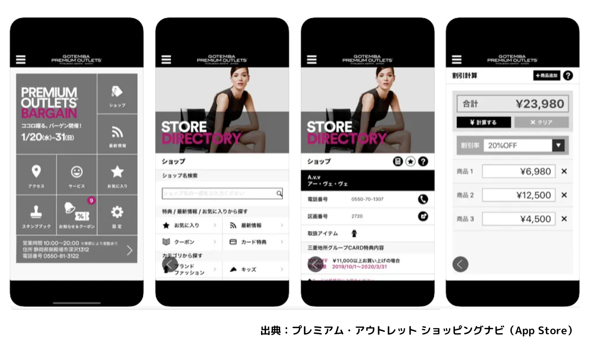 お得にブランド商品を購入できるプレミアム・アウトレットでは、「プレミアム・アウトレット ショッピングナビ」アプリを提供しています。