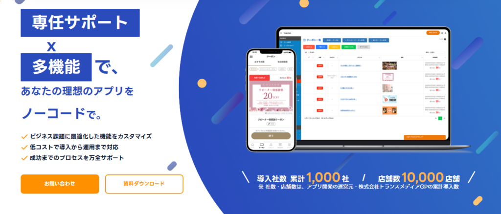 弊社トランスメディアでは、ホテル向けアプリ作成サービス「店舗アプリ」を提供しています。予約導線や情報配信、リピーター施策までを一元化でき、初めてのアプリ導入でも安心して運用できる点が特長です。ホテルのDXや直販強化をご検討の方は、ぜひ一度お気軽にお問い合わせください。
